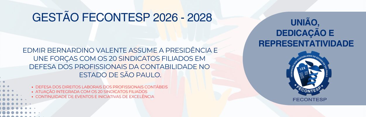 Em 1º de janeiro de 2026, o contador Edmir Bernardino Valente, juntamente com sua diretoria, assumiu a Presidência da Fecontesp, para o triênio 2026-2028 com metas de gestão bem definidas, pautadas por três eixos principais: fortalecimento institucional, valorização das entidades filiadas e atuação propositiva junto aos poderes públicos e à sociedade. Assim, a nova Diretoria dará continuidade à promoção da educação profissional continuada e outros benefícios em favor dos profissionais da Contabilidade do Estado de São Paulo.